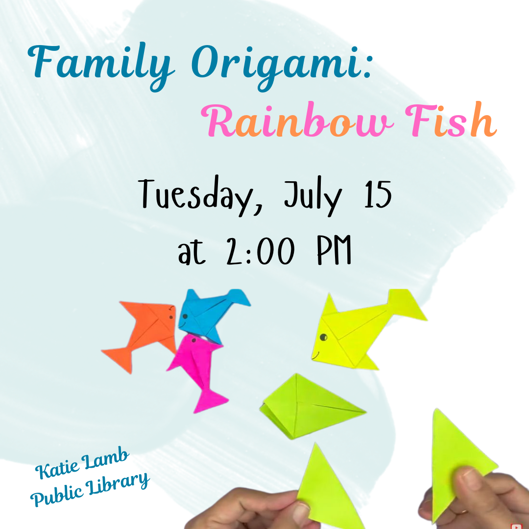 Join local Math teacher and origami artist Ms. Shirley for some Summer fun and paper crafting. We will learn to fold colorful and crafty rainbow fish for our 2025 Summer Reading theme “Color Our World.” This program is open to anyone in the community, free with no library card membership requirement.