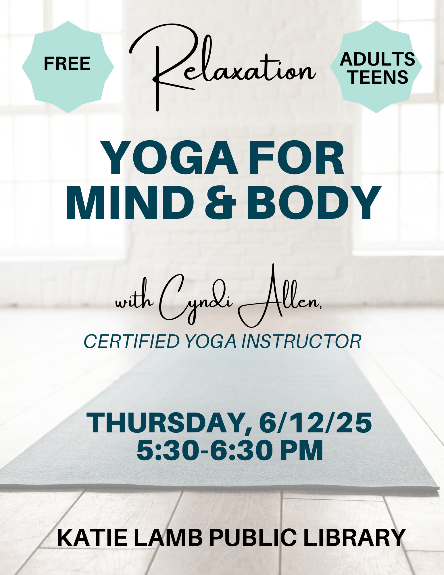 Library Meeting Room 9318 Apison Pike, Collegedale, TN, United StatesLocal community member and Certified Yoga Instructor Cyndi Allen will be leading us through a beginner yoga class focused on relaxation. We will read a passage related to self-care and then she will lead us in some beginning Cyndi currently teaches yoga around the Chattanooga area - including Chattanooga Yoga Center of Ooltewah https://thechattanoogayogacenter.com/. Bring […]