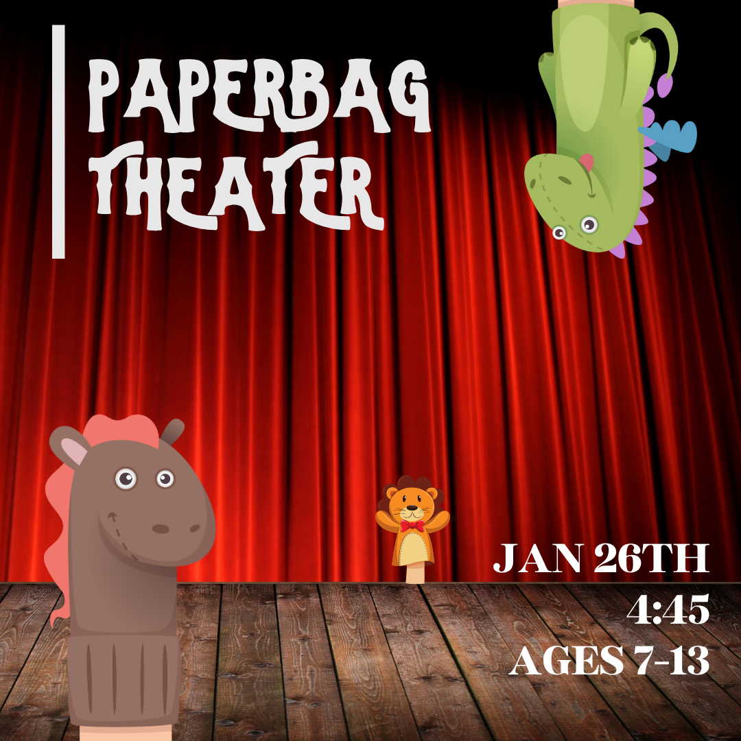 Enter the world of theater through puppets! Make a puppet out of a paper bag, create a story with other participants, and perform it on the puppet stage. Ages 7-13.