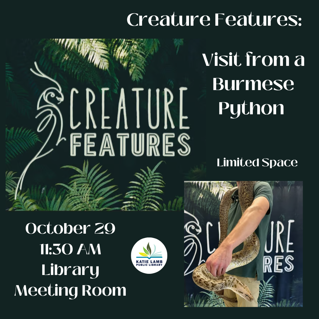 Get ready for an exciting and unique visit from Creature Features of Tennessee, https://creaturefeaturestn.com/! Our friends at Creature Features will be bringing Grant - their 10+ foot long Burmese Python. He is a really amazing snake with gorgeous markings and fascinating facts that are sure to wow you and your family! Limited availability!