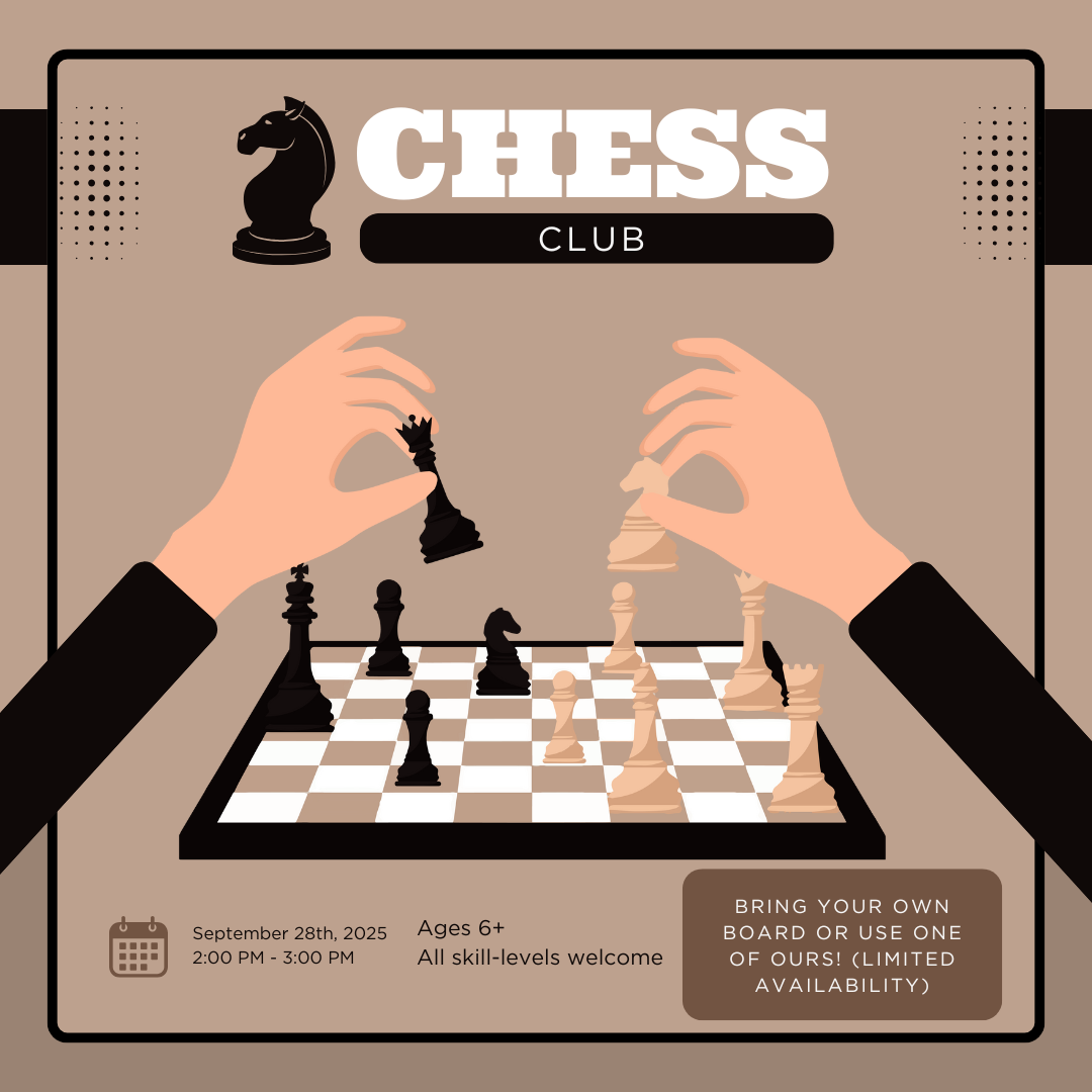 Sharpen your strategic skills at Chess Club! Whether you’re a beginner or seasoned player, this session helps develop logical reasoning, pattern recognition, and strategic planning. Chess-themed books and guides will be available for newcomers, and friendly matches will help build skills and confidence. The library has limited boards, please bring your own if possible!