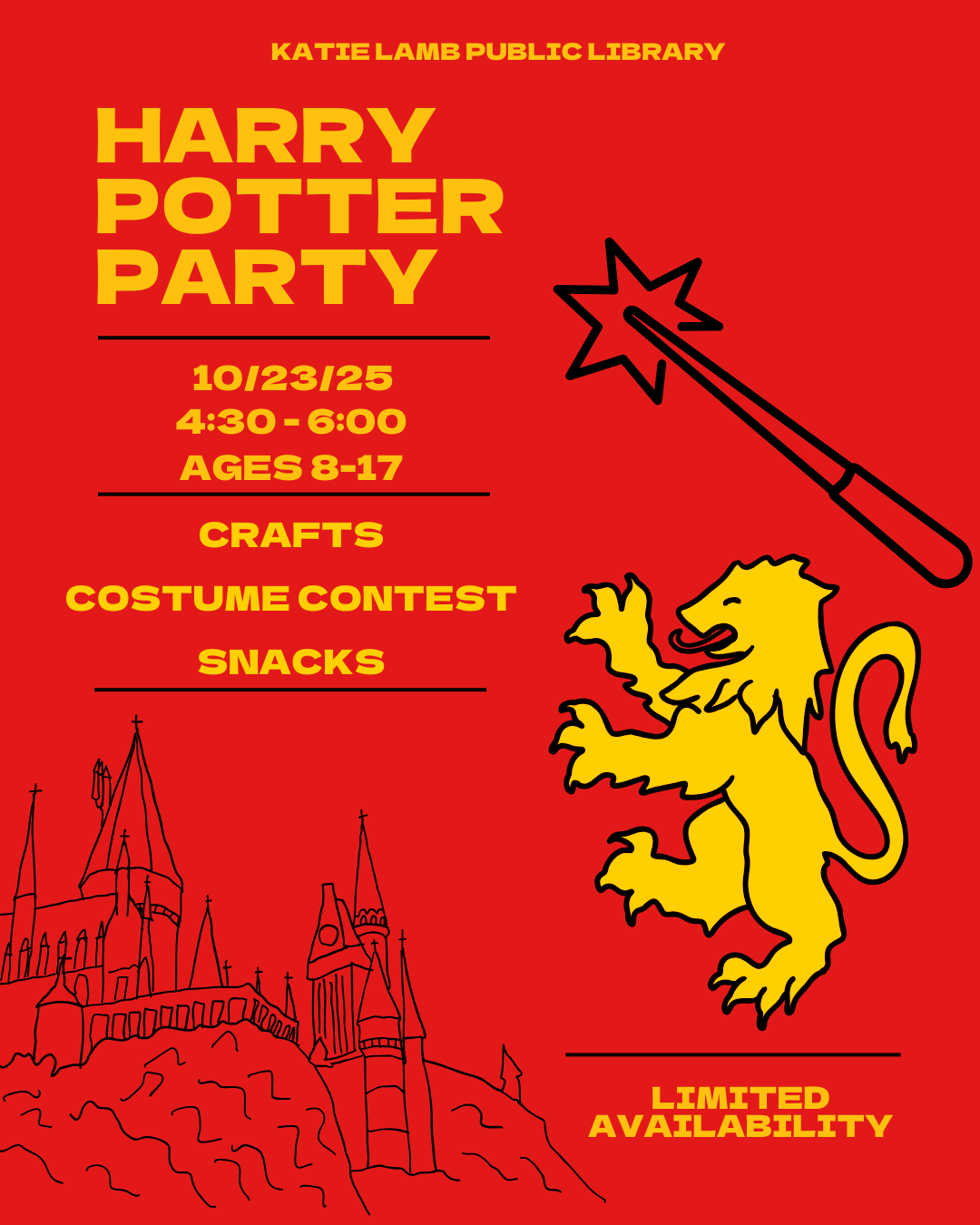 Come celebrate Harry Potter at the library! There will be themed snacks, crafts, and a costume contest! Ages 8-17. Limited availability.