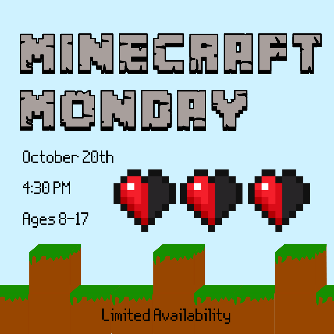 Build, explore, and collaborate at Minecraft Monday! Unleash your creativity as you construct and code in Minecraft, practice spatial reasoning, and even develop stories or quests within your builds. Minecraft-themed books will be on display to inspire both gameplay and reading. Join us for an hour of gaming, building, and storytelling. Laptops are provided, and […]