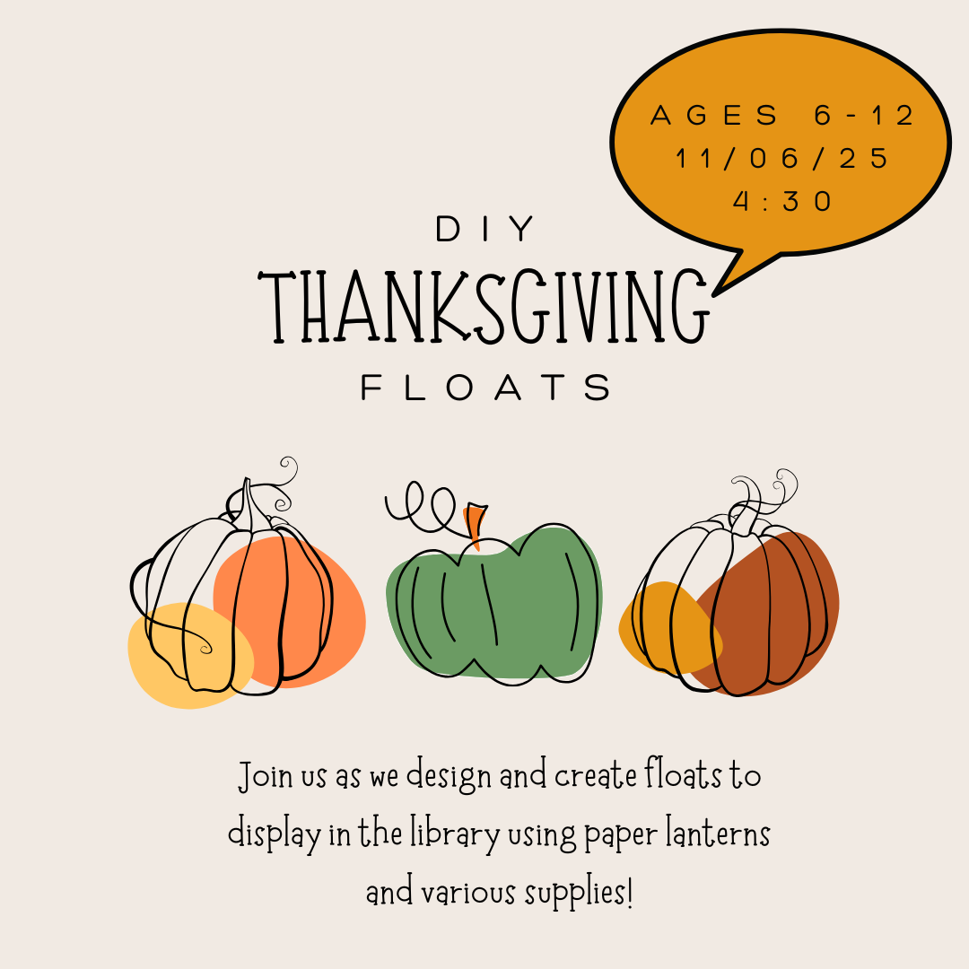 Design and decorate your own Thanksgiving parade float using paper lanterns and other various craft supplies! The library will display your creation through November, and then you can take it home with you! Ages 6-12. Limited availability.
