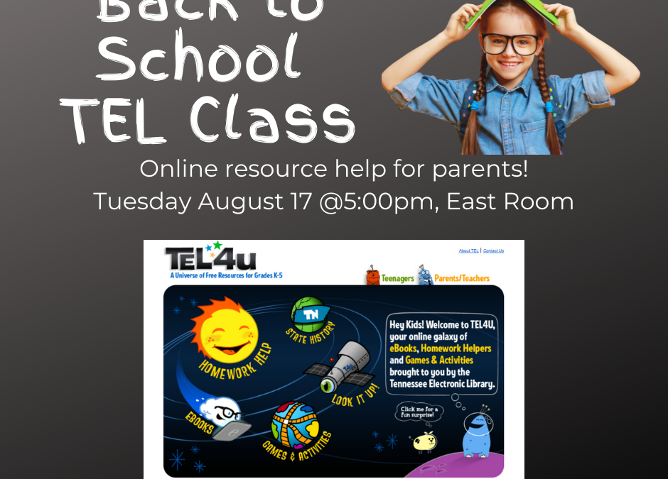 Did you know there are many free resources available to students through the Tennessee Electronic Library? Join us in the East Room at City Hall to learn how to use TEL for homework help, project research, and more!